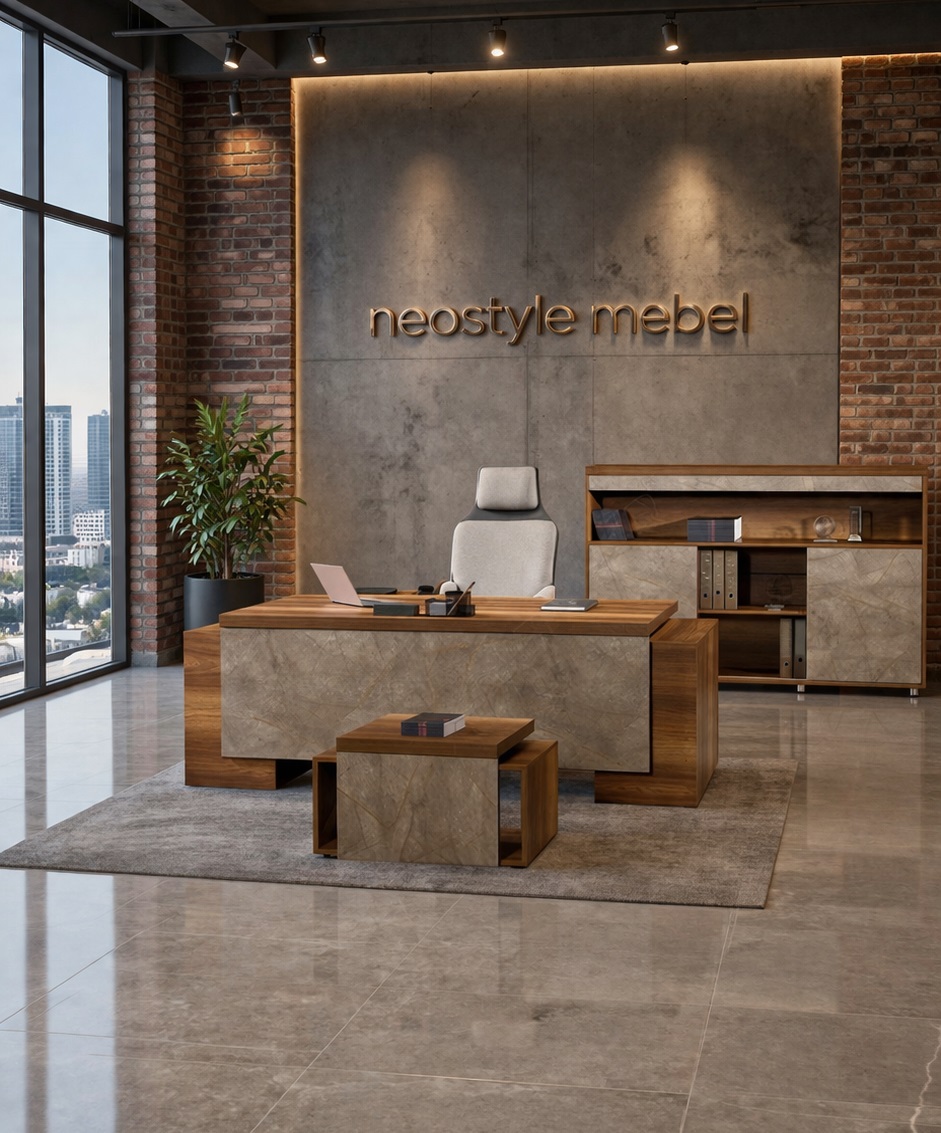 Rəhbər masasi, komod və jurnal masası. Ölçüləri 220*150sm, Masanın üstü 175x80sm, yan köməkçi hissə 150*45sm. oturacaq qiymətə daxil deyil. Sifarişlə hazırlanır. Rəngdə və ölçülərdə dəyişiklik etmək olar.