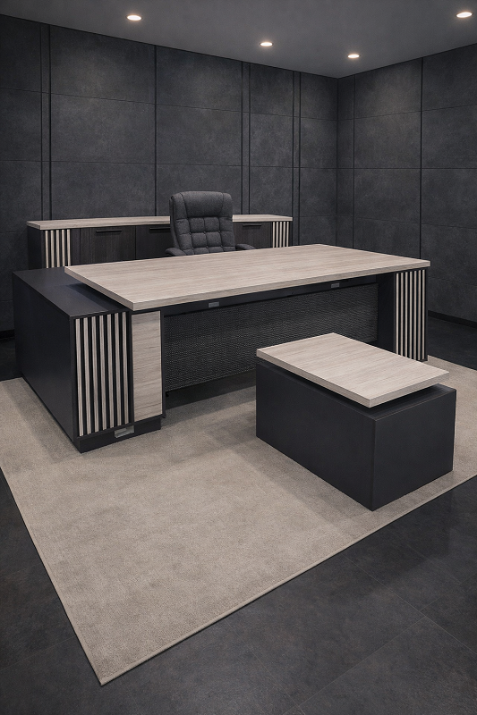 Ofis mebeli. Rəhbər masasi, jurnal masası və kamod. Sifarişlə hazırlanır. Ölçüləri: umumi olcusu 220*150 sm, masanin üst hissesi 190*80 sm, yan komekci hissə 150*50 sm, jurnal masasi 82*50 sm, hundurluk 49sm, komod 223*40 sm, hundurluyu 97 sm, kreslo qiymətə daxil deyil.