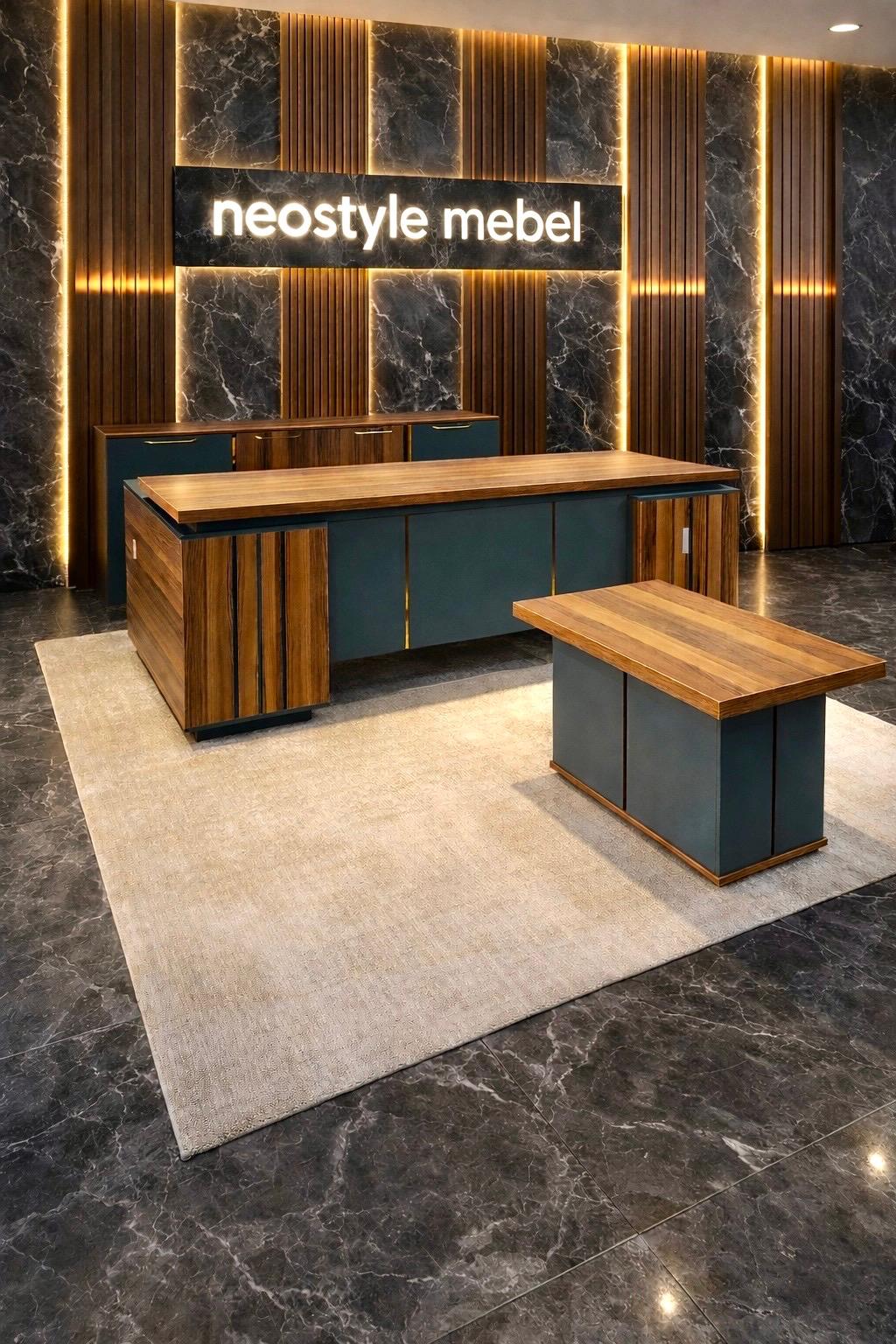 Ofis mebeli. Rəhbər masasi, jurnal masası və komod. Oturacaq qiymətə daxil deyil. Ölçüləri: ümumi 220*150, masanin üstü 220*80sm, yan köməkçi hissə 150*50sm