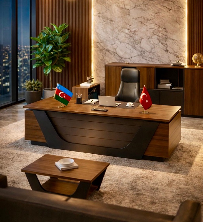 Rəhbər masası. Sifarişlə yığılır. rəngdə və ölçülərdə dəyişiklik etmək olar. Ölçüləri: MASA - ümumi ölçüsü 220*80 sm, yan komekci hisse - 90*50 sm, KOMOD - 220X40x115sm, JURNAL MASASI - 80x50x50sm.