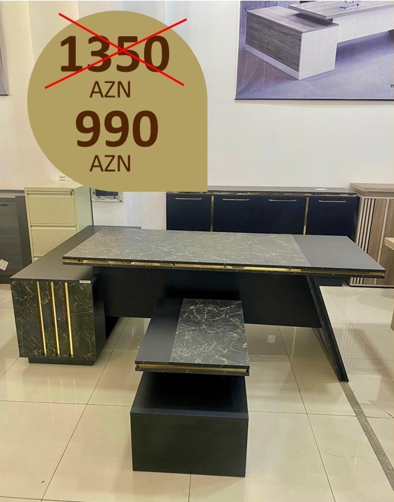 Hazır mebellərə -25% Bayram Fürsəti! – Gözləməyin, ofisinizi elə indi yeniləyin. Hazır qurulu 1350AZN deyil 990AZN. Ofis mebeli. Rəhbər masasi, jurnal masası və komod. Oturacaq qiymətə daxil deyil. Ölçüləri: ümumi 217*150, masanin üstü 185*80sm, yan köməkçi hissə 150*50sm