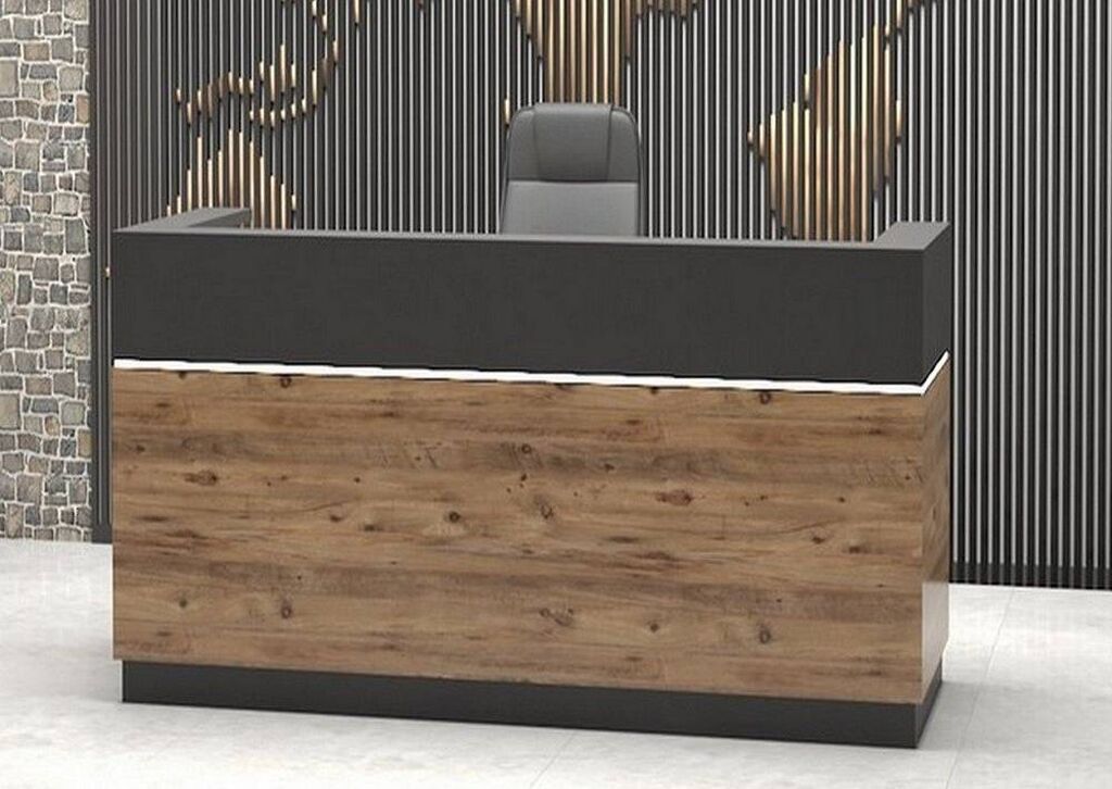 Reception masası sifarişlə yığılır. eni 200sm, dərinlik 60sm, hündürlük 110sm içində 1 siyirmə və 1 şkaf. Rəngdə və ölçülərdə dəyişiklik etmək olar