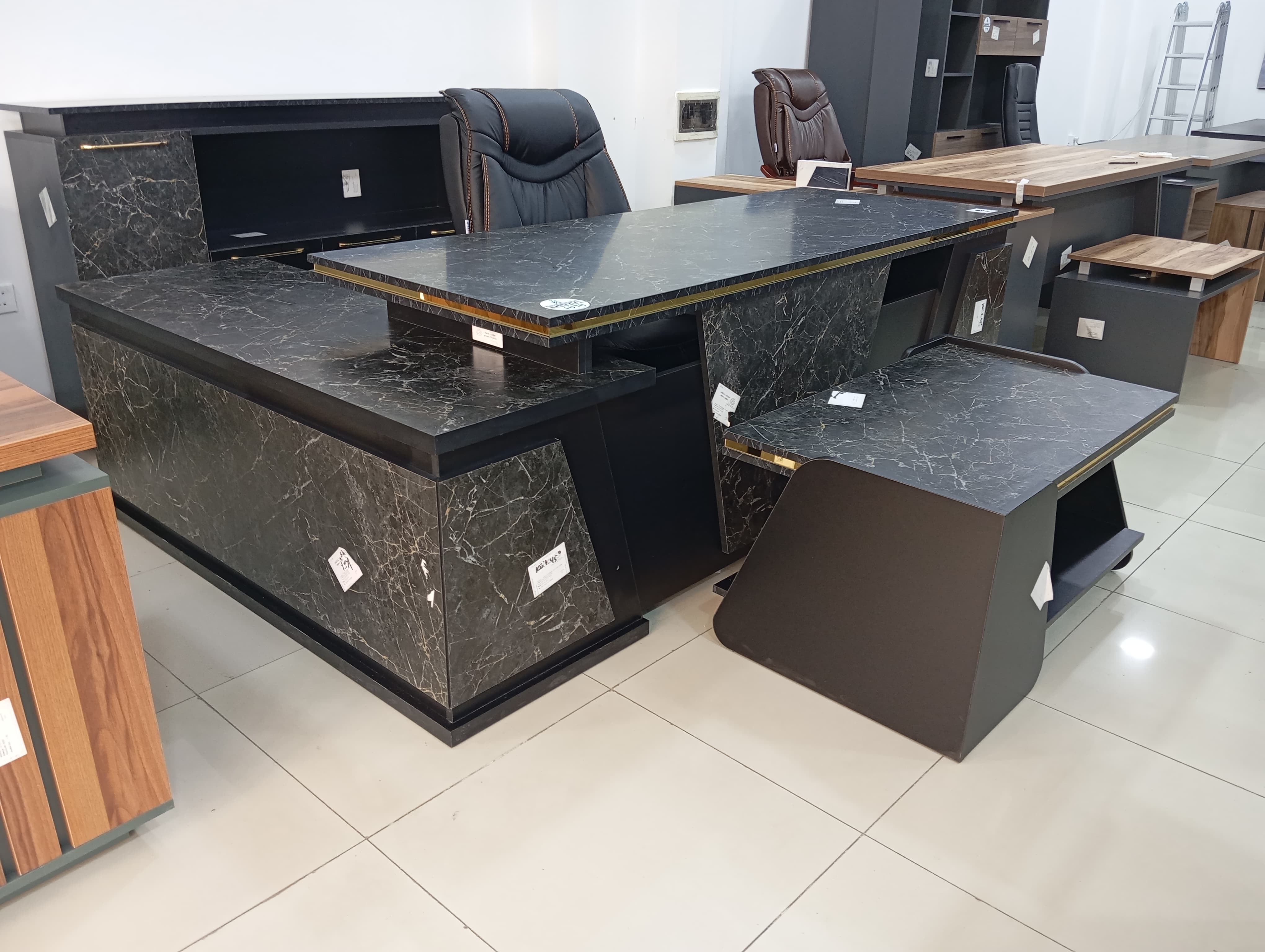 Ofis mebeli. Rəhbər masasi, jurnal masası və komod. Ölçüləri: ümumi 227*160, masanin üstü 200*80sm, yan köməkçi hissə 160*50sm Jurnal masası 100*60sm, hündürlük 51sm Komod 200*40sm hündürlüyü 108sm Oturacaq qiymətə daxil deyil.