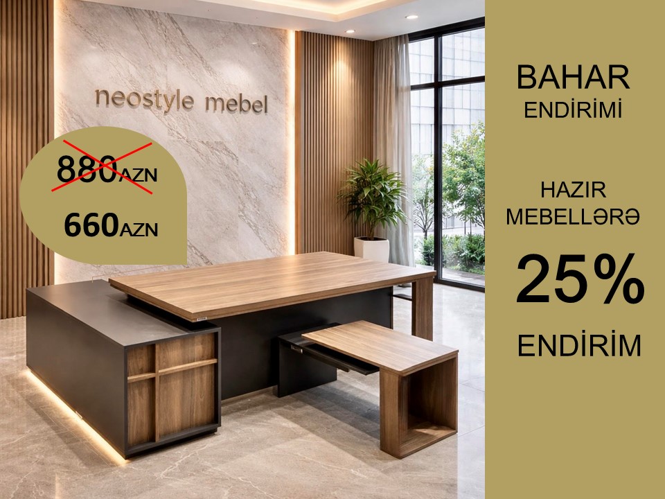 Hazır ofis mebellərinə 25% endirim. 880AZN deyil 660AZN BAHAR KAMPANİYASINDAN yararlanın. Kampaniya qısa müddətdə keçərli olacaq. TƏLƏSİN! Rəhbər masasi və jurnal masası. Ölçüləri: ümumi 235*155, masanin üstü 200*80sm, yan köməkçi hissə 155*55sm.