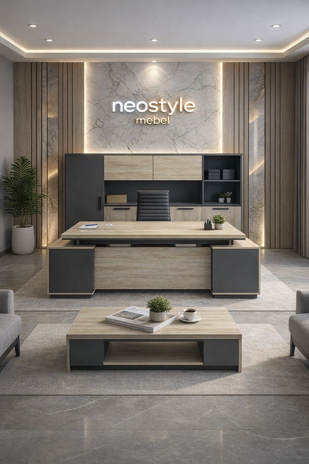 Ofis mebeli. Sifarişlə hazırlanır. Rəhbər masasi, jurnal masası və dolab. Oturacaq qiymətə daxil deyil. Ölçüləri: ümumi 240*170, masanin üstü 200*80sm, yan köməkçi hissə 170*50sm Dolab eni 240sm, hündürlüyü 183sm, dərinliyi 40sm