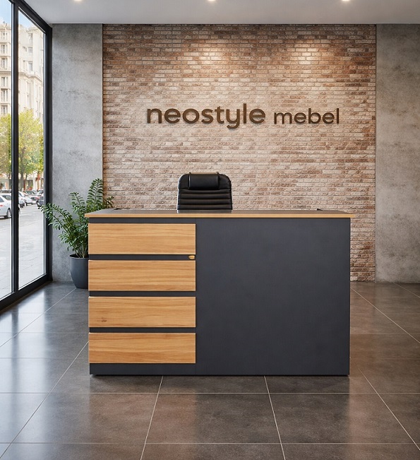 Reception masası sifarişlə yığılır. uzunluq 150sm, eni 55sm, hündürlük 110sm. içində 1 siyirmə və 1 şkafla.
