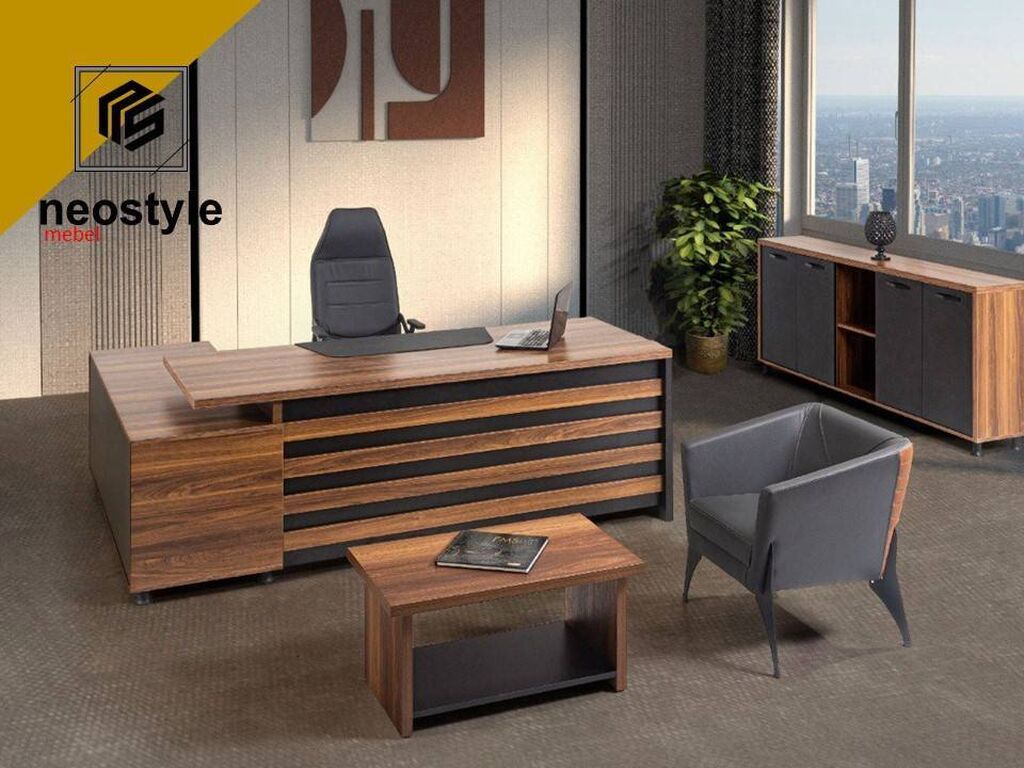 Ofis mebeli sifarişlə yığılır. Masanın üst hissəsi qalınlaşma ilə 36mm, qalan hissələr 18mm. ÖLÇÜLER: Masa (205x150x75sm). masanın üst hissəsi (180x75sm) . Yan köməkçi hissə (150x50sm). Jurnal masası (90x50x45sm). komod (200x38x90sm). Masa, jurnal masası və komod hər üçünün üst hissəsi qalınlaşma ilə 36mm. oturacaqlar qiymətə daxil deyil. Rəngdə və ölçülərdə dəyişiklik etmək olar.