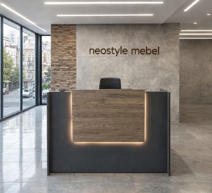 Reception masası sifarişlə yığılır. eni 150sm, dərinlik 55sm, hündürlük 110sm led işıqla -380AZN içində 1 siyirmə və 1 şkaf.